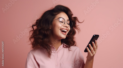 portrait of young woman with smartphone isolated on pink background
