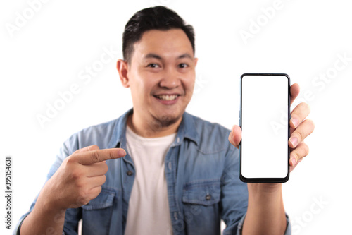 Portrait of young young Asian man presenting smart phone mockup with happy cheerful expression