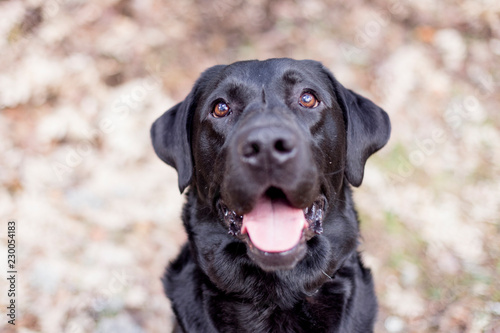 portrait outdoors of a beautiful black labrador sitting on the floor and looking at the camera. pets outdoors