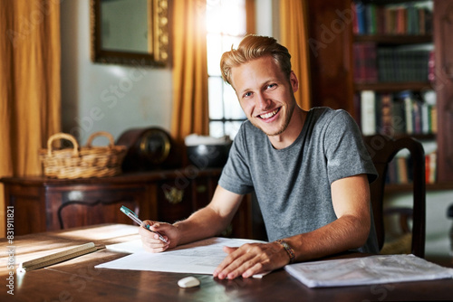 Portrait, paperwork and man with remote work in home office with taxes, bills and audit document. Creative, person and writing budget for finance, investment and review invoice for project with info