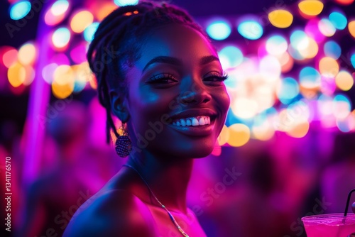 Portrait photo of a 25-year-old Black woman with a euphoric expression, visibly intoxicated, standing under neon festival lights with a cocktail in hand