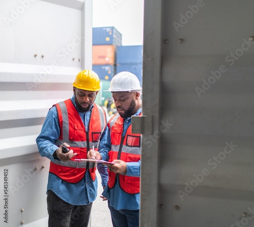 Portrait photo of the moment of two black african male container engineers working and inspecting containers around a shipping yard of a local logistic freight forwarder company