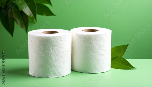 Portrait photo of toilet paper on a plain soft green background with leaf decoration