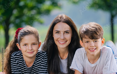 Portrait picture of beautiful young mother with two children outdoors