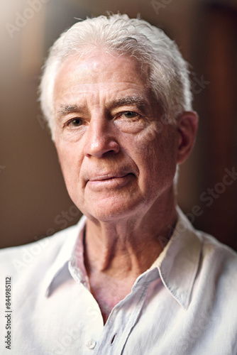 Portrait, pride or senior man in home to relax with wellness or confidence in living room or apartment. Break, face or elderly male person resting with peace or comfort in retirement, lounge or house