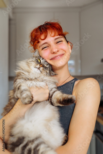 portrait red-haired teenage girl with gray fluffy cat
