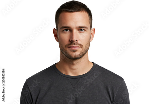 Portrait Serious Young Man Dark Hair Casual TShirt Studio Background guy men male face look model