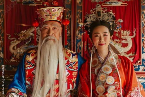 Portrait showcasing the rich details of chinese wedding costumes, worn by an elderly man and a young woman
