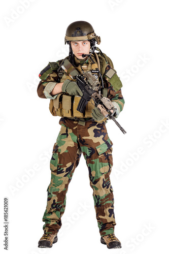 Portrait soldier or private military contractor holding sniper rifle.