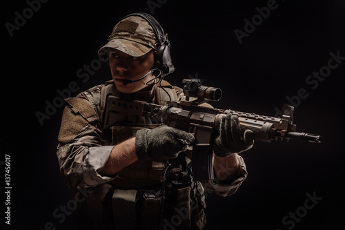 Portrait soldier or private military contractor holding sniper rifle. war, army, weapon, technology and people concept. Image on a black background.