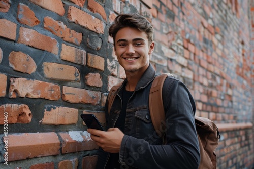 Portrait, success, Asian man with smartphone, brick wall, or creative, connection, or typing bliss. Face, male employee or entrepreneur using cellphone, network, or signal.