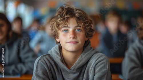 Portrait teenage boy sitting in a classroom in early morning on back to school day --ar 16:9 --style raw --stylize 750 Job ID: f9ca9313-66aa-4849-a6e7-d8d913653657