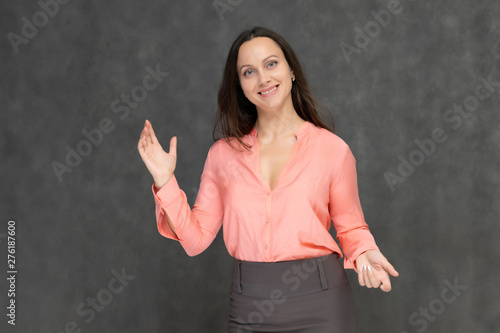 Portrait to the waist a young pretty brunette manager woman of 30 years in business clothes with beautiful dark hair. It is standing on a gray background, talking, showing hands, with emotions