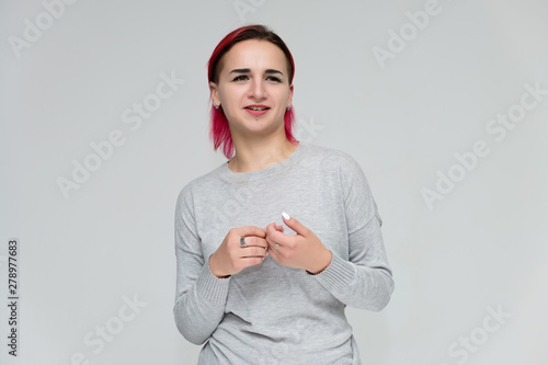 Portrait to the waist of a pretty girl with red hair on a white background in a gray sweater. Standing right in front of the camera in a studio with emotions, talking, showing hands, smiling