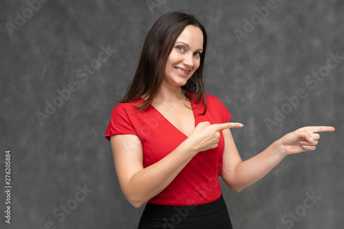Portrait to the waist of a young pretty brunette woman of 30 years old in a bright red sweater with beautiful dark hair. It is standing on a gray background, talking, showing hands, with emotions