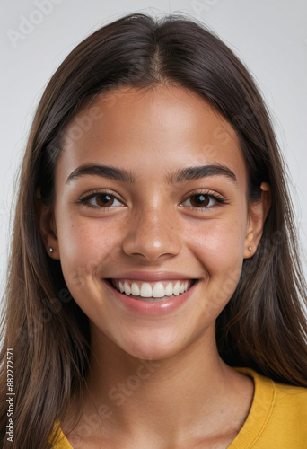 Portrait view of a regular happy smiling Colombia girl, ultra realistic, candid, social media, avatar image, plain solid background