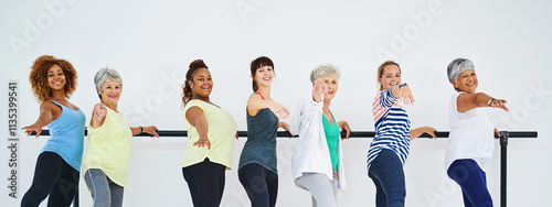 Portrait, women and warm up with yoga in class for fitness, community support and training of balance. Banner, people and stretching for pilates coaching, exercise and peace with wellness membership