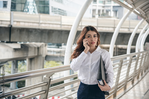 Portraits of beautiful asian woman look confidence is standing and holding cellphone . she using smartphone calling to conversation with customer.
