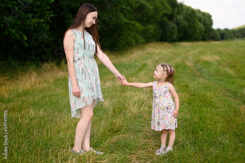 Portraits of joyful mother and daughter spend time together, enjoy happy family time, walk in the park. The concept of a happy family, family day,mother's day, countryside vacation, unity with nature.