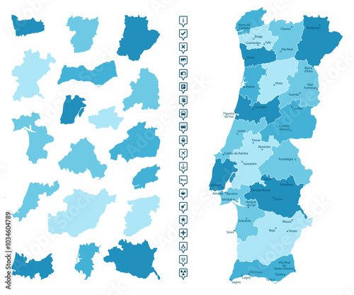 Portugal - detailed map of the country in blue colors, divided into regions. Infographic icons. Vector illustration.