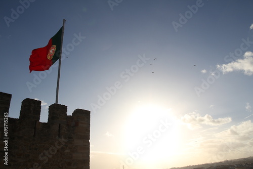 Portugal Country flag atop the castle flutters proudly as the vibrant sun casts a golden glow behind it.