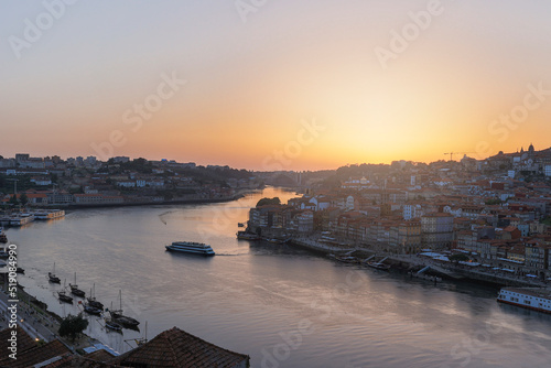 Portugal, Porto District, Vila NovadeGaia, Douro River and surrounding city at sunset