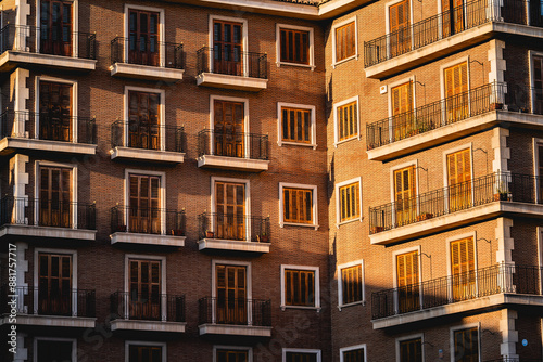 Portuguese exterior apartment facade with fine Portuguese architecture and balcony during sunset
