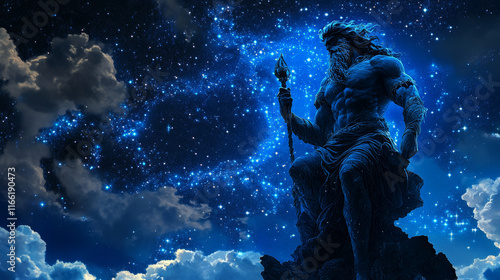 Poseidon. A grid of blue stars in the night sky. Points of light create the form of Poseidon