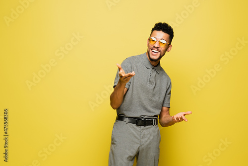 positive african american man in sunglasses and grey tennis shirt gesturing isolated on yellow.