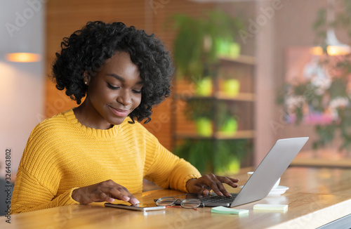 Positive afro businesswoman working online and using mobile phone