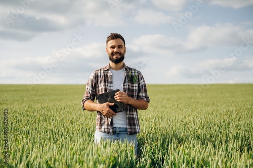Positive facial expression, smiling. Man farmer is on the agricultural field
