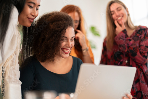 Positive female worker with crop multiracial colleagues in casual clothes gathered at table with laptop and smiling while looking at screen and working together in office