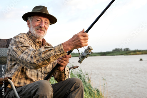 Positive gray-haired man fishing on lake in nature, patience and recreation concept.Portrait of senior caucasian fisherman with rod sitting on chair in nature, countryside, smiling at camera