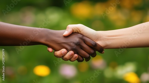 Positive interaction in nature handshake exchange in a beautiful garden setting
