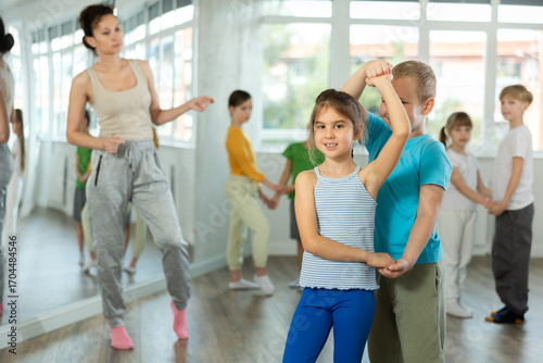 Positive juvenile boy and girl doing ballroom dance in pair in training room during workout session
