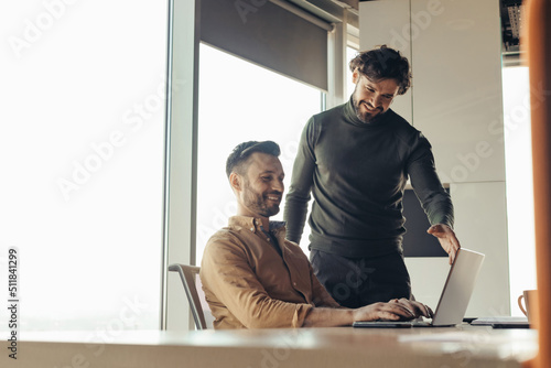 Positive male colleagues discussing common project, using laptop, brainstorming for ideas at modern office, empty space