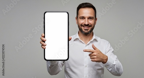 Positive male entrepreneur in shirt pointing at giant blank smartphone screen in hand, businessman recommending new mobile application or website on grey background, mockup