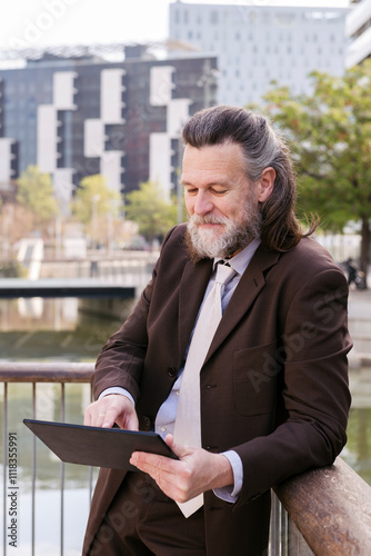 positive middle age male with beard in formal outfit browsing tablet while standing at city, concept of business and mature man lifestyle, copyspace for text