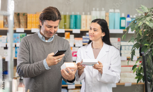 Positive middle-aged man scanning QR on pills box while pharmacist consulting him in chemistry