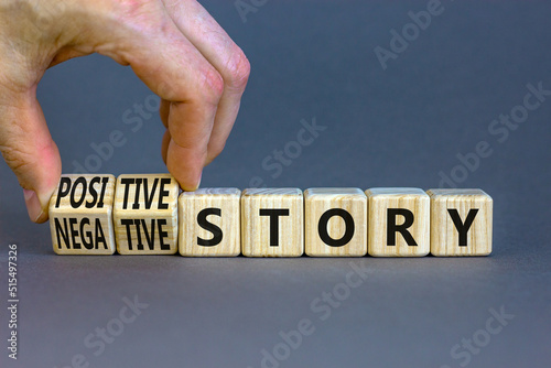 Positive or negative story symbol. Businessman turns cubes, changes concept words Negative story to Positive story. Beautiful grey background. Business positive or negative story concept. Copy space.