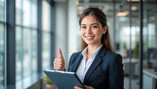 Positive Outlook: An accomplished businesswoman radiates confidence, giving a thumbs-up, her smile mirroring success, framed by a modern office setting.