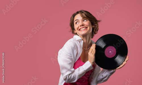 Positive short haired woman with vinyl record disc on pink. Hobby, music lover, collection, nostalgia lifestyle. Copy space.