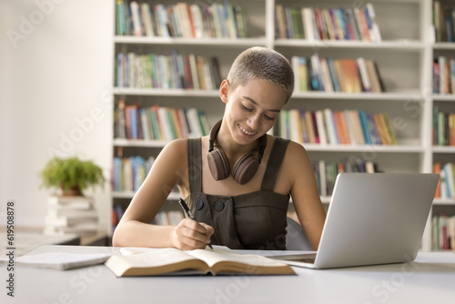 Positive student girl studying in campus library, writing notes, listening to webinar, online lesson on laptop, doing academic research study, enjoying education, knowledge