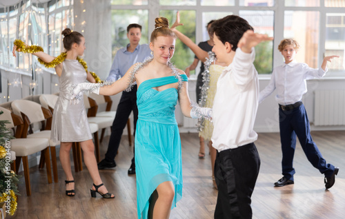 Positive teen boy and girl are dancing classic version of waltz in couple during lesson at studio in New Year atmosphere. Leisure activities and physical activity for positive children.