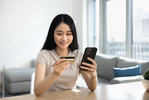 Positive young Asian woman paying by credit card on ecommerce service, using online bank application on smartphone for business financial communication, shopping on Internet, booking hotel