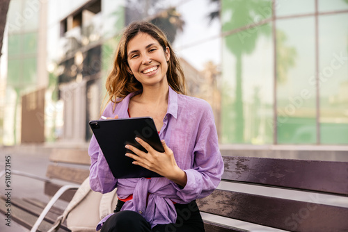 Positive young caucasian woman holding tablet smiling looking at camera outside. Brown-haired wears purple shirt to street. Social media addiction concept