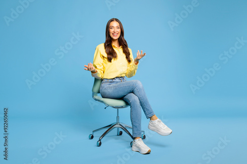 Positive young European woman talking and gesturing, looking at camera while sitting on chair over blue studio background