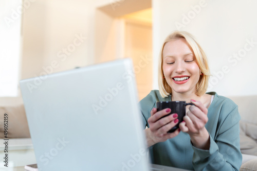 Positive young woman freelancer watching video in blog on netbook and having a coffee at comfortable home. Beautiful young business woman working on laptop.Freelancer connecting to internet
