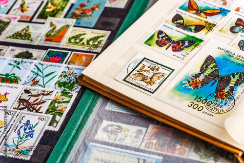 Postage stamps. Collection of stamps and magnifying glass. Collection of world stamps in a stack demonstrates the theme of flora and fauna. Postage stamps of different countries and times