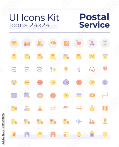 Postal service flat color ui icons set. Parcel delivery. Send and receive letter. Mailing. GUI, UX design for mobile app. Vector isolated RGB pictograms. Montserrat Bold, Light fonts used